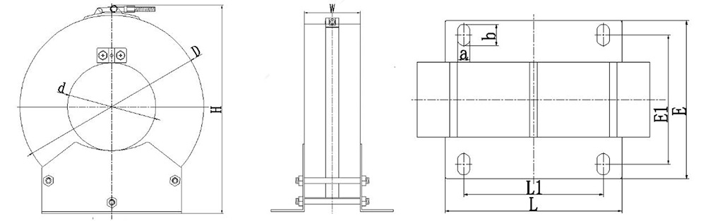 本系列零序互感器用兩個(gè)樹(shù)脂澆注成型的半圓環(huán)對接而成。安裝時(shí)打開(kāi)圓環(huán)安放電纜于內孔,然后用夾緊箍將兩個(gè)半圓環(huán)禁錮成整體。因此使用較為方便。