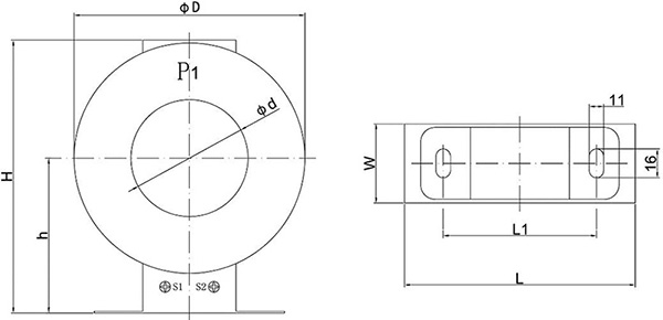 本型互感器為環(huán)形鐵芯,二次線(xiàn)圈沿鐵芯徑向均勻繞制,外殼采用樹(shù)脂澆注,中間留有圓孔供一次電纜穿過(guò)之用?;ジ衅鞯谋砻鏄擞蠵1、S1、S2字樣,當一次電流從P1流入時(shí),二次電流由S1流出經(jīng)外部回路回到S2。